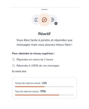 Pour passer au badge réactif, il faut que vous répondiez à 70% de vos messages dans un délai entre 1h et 24h.