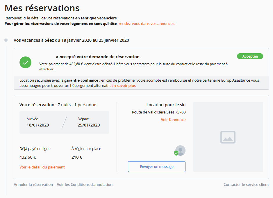 - Identifiez la réservation qui vous intéresse et cliquez sur le bouton "Envoyer un message", sous le nom du vendeur.